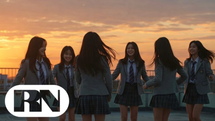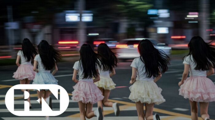 使用ワード:フリフリのミニスカート、東京の夜の街を6人の女の子が走っているなど